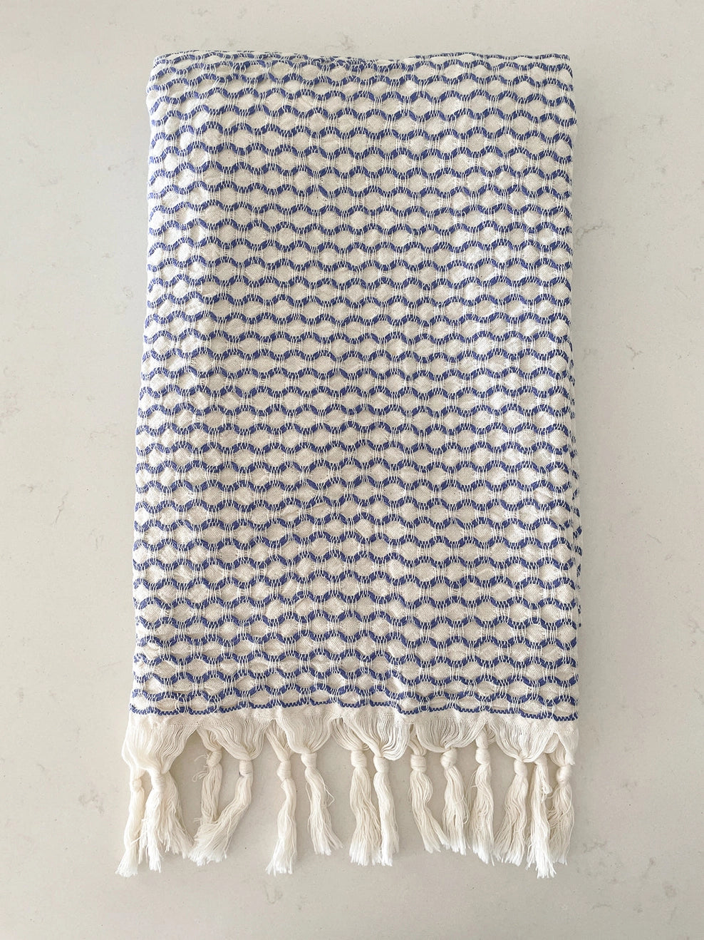 The Beach Wave Turkish Cotton Beach Towel is made with soft lightweight breathable naturally wicking cotton and finished with a twisted self fringe. This towel is versatile and can be used as a chic pool, beach towel or even a picnic blanket. Yarns are woven to create a wavy pattern inspired by the ocean.